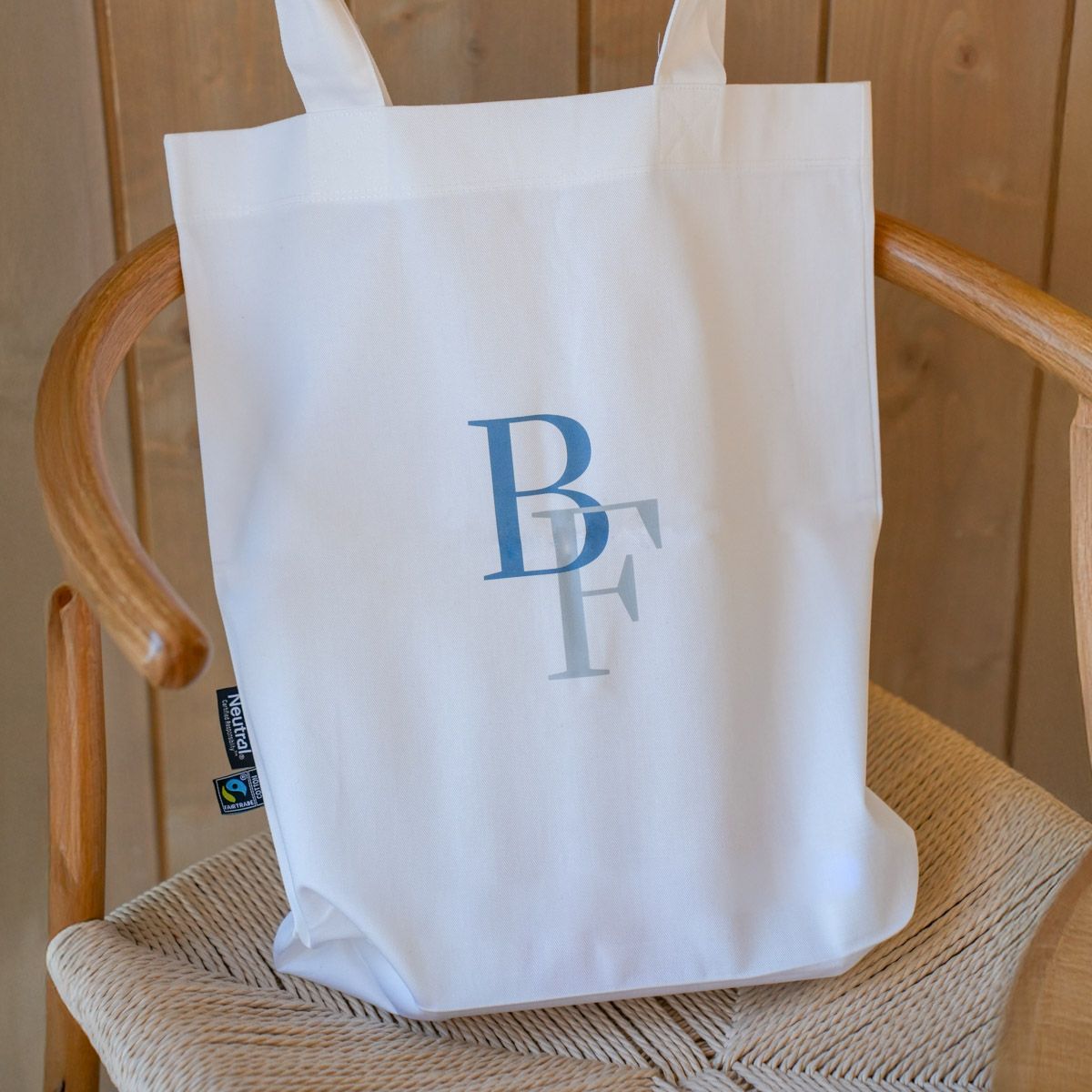 Bio Baumwolltasche mit verstärkten Nähten an besonders beanspruchten Stellen und Tragegriffen mit einer Länge von 66cm, womit sie sowohl als Schulter-, wie auch als Tragetasche benutzt werden kann.